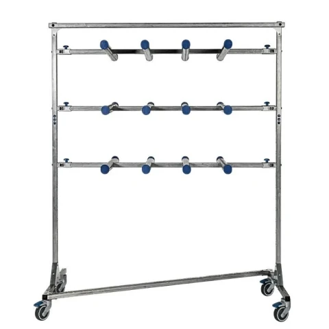 The bag trolley has a zeta-shaped base and folding arms. These features mean that bag trolleys can be stacked when not in use, optimising space in production, quality control or packaging departments.